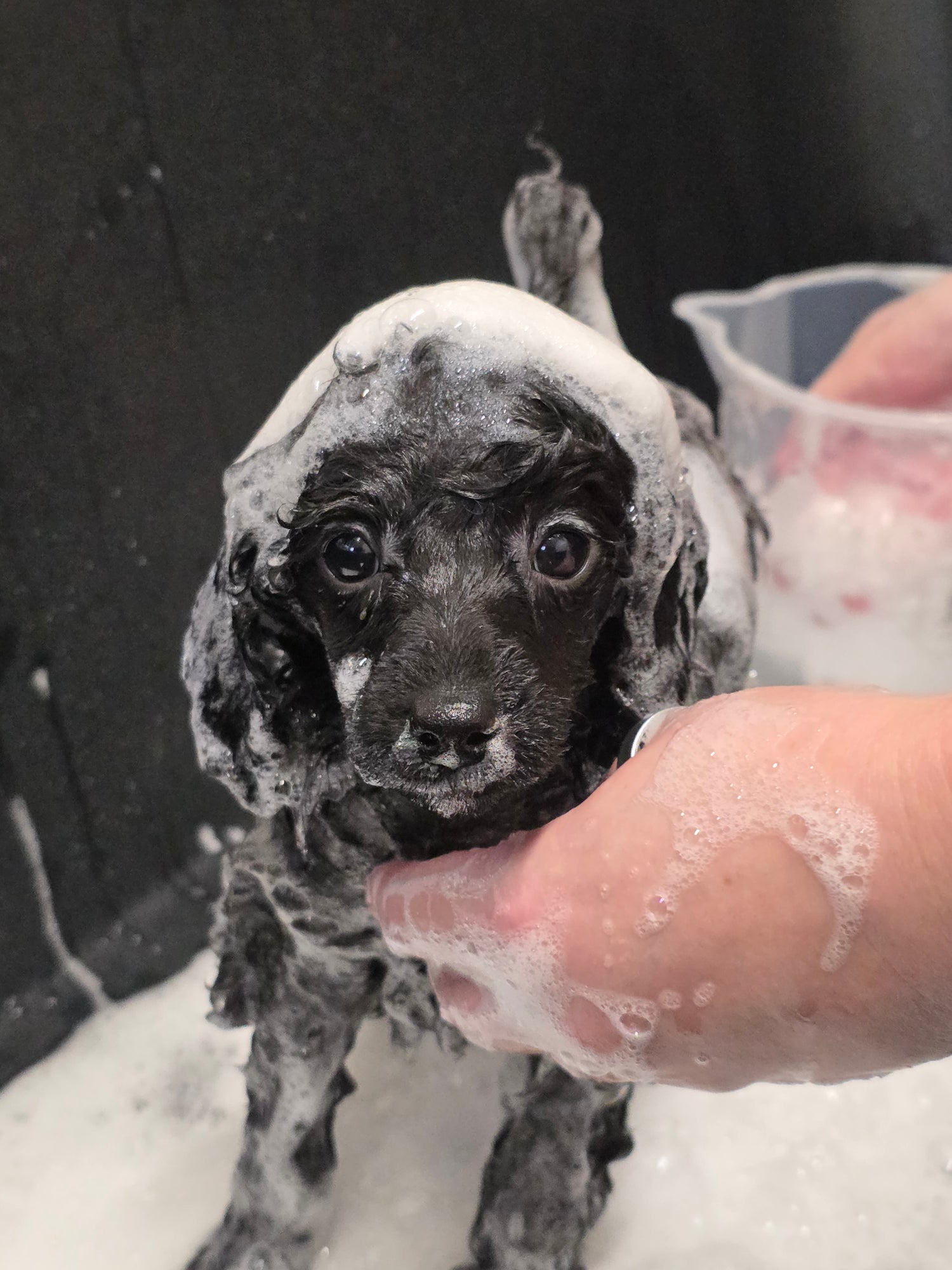 Many dog grooming products rely on harsh detergents to create foam (SLS and SLES). When they are used regularly, these formulas can strip the dog's coat of its natural oils, which dry the skin and coat and cause irritation for the dog's and dog groomers' hands.